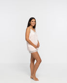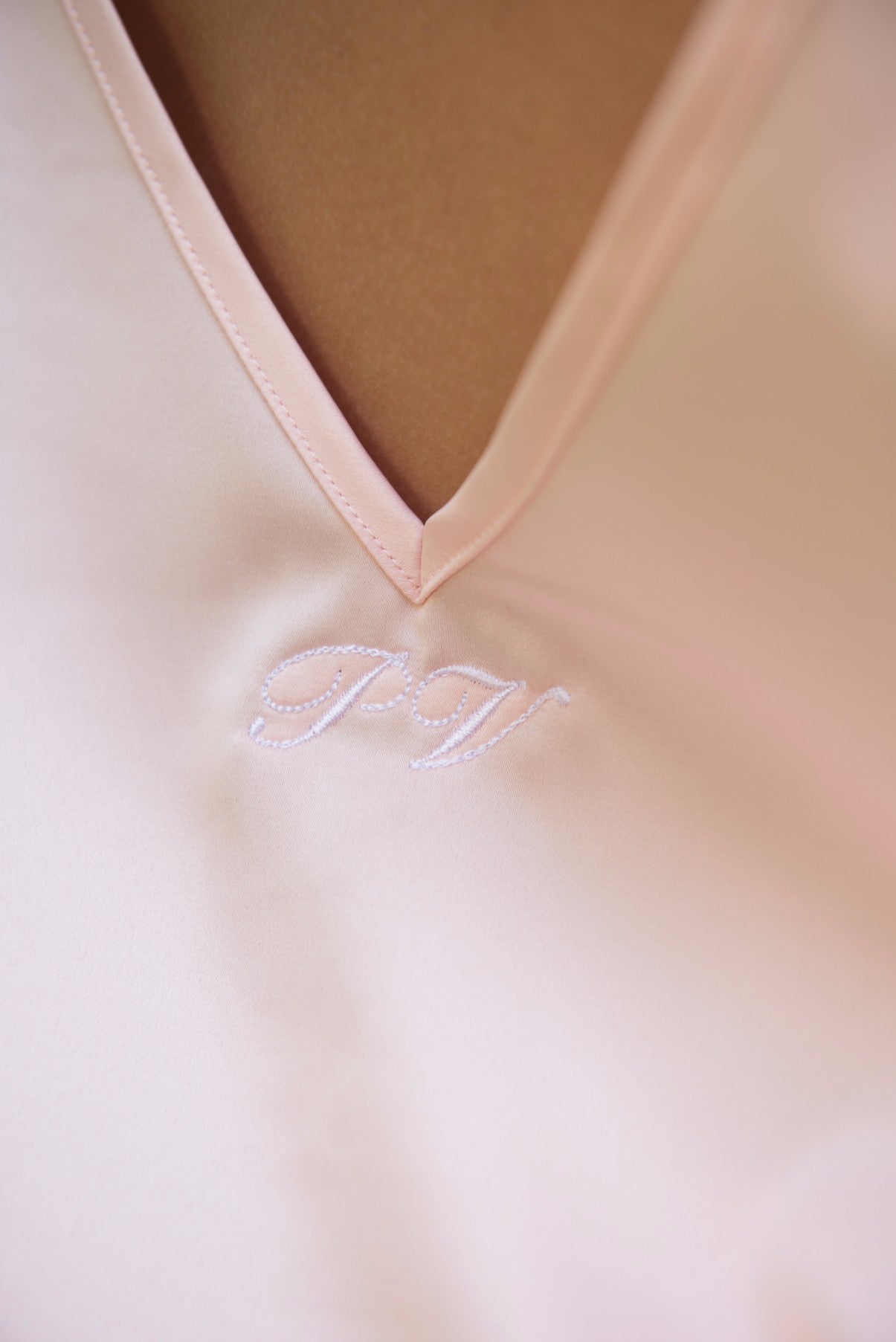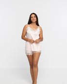 It's time to get intimate with our lace collection. This ultra-luxe and super sexy cami + short set can be made extra personal w. your embroidered initials in blind baby pink on the back of the V cami.