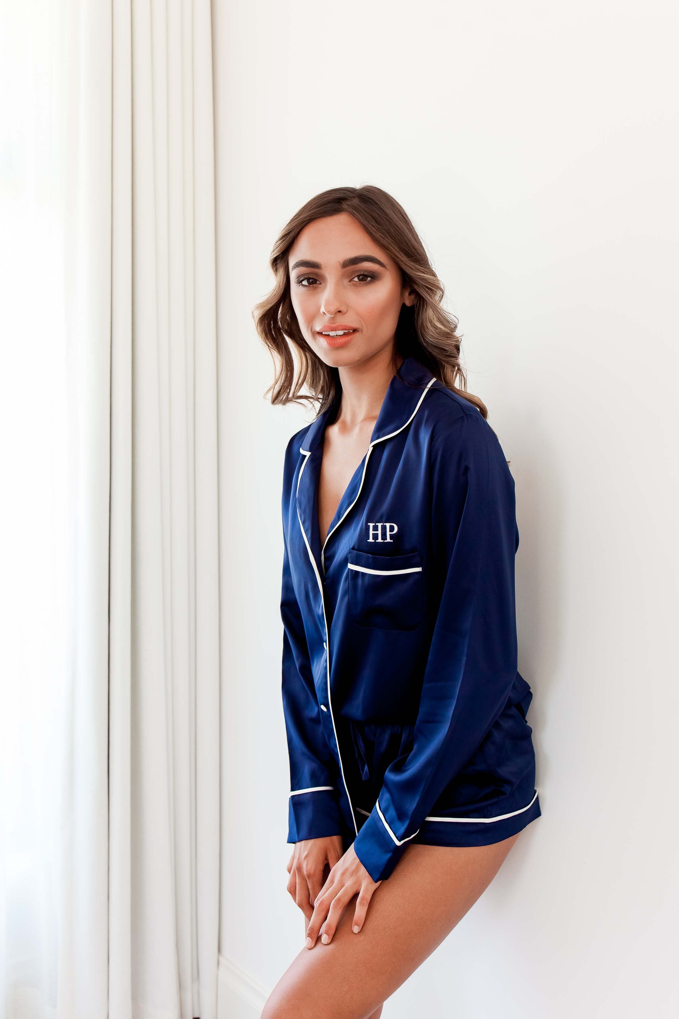 The OG of sleepwear! Our classic Spring W. The Enemy long sleeve top w. drawstring shorts in navy and white contrast piping can be made extra personal w. your choice of name, initials or emoji embroidery.
