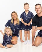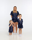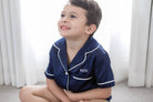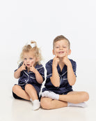 We cannot deal w. this cuteness! Our adorable Summer Mini short sleeve top w. drawstring shorts in navy and contrast white piping can be made extra personal w. your minis name, initials or emoji embroidery.