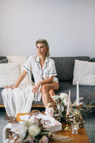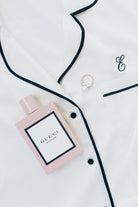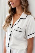 The OG of sleepwear! Our classic Summer W. The Enemy short sleeve top w. drawstring shorts in ivory and black contrast piping can be made extra personal w. your choice of name, initials or emoji embroidery.